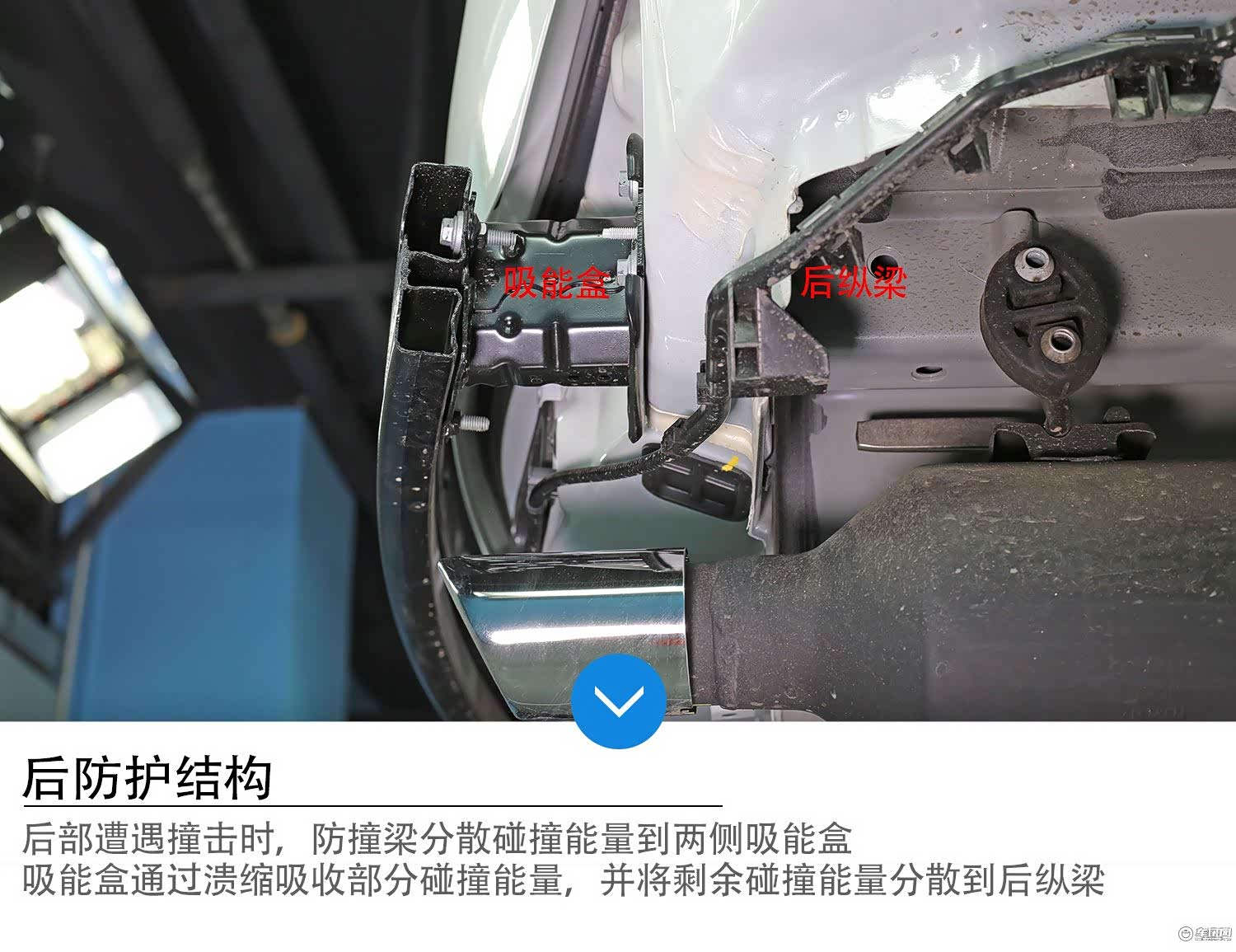 如上图所示,荣放后部防护结构同样接壤了白车身的后部纵梁,也就是“车身骨架”,在车辆遭遇追尾撞击时,碰撞能量被防撞梁分散到左右两侧吸能盒,并进一步向车身后纵梁传导。