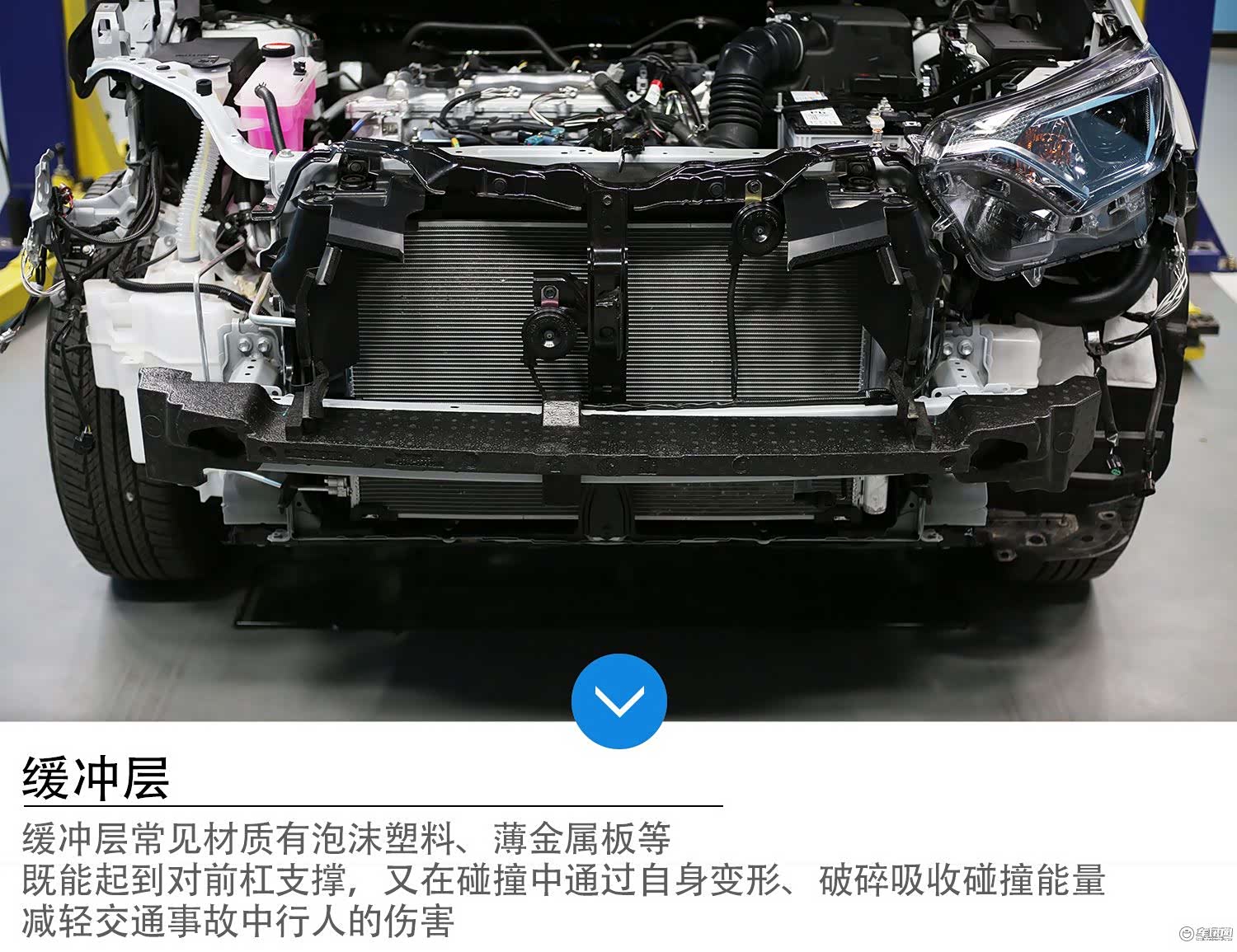 在车辆撞击行人的情况下,前后防护结构还要具备减轻行人伤害的作用,例如泡沫缓冲层,行人防卷入机构等就是为了降低行人伤害。