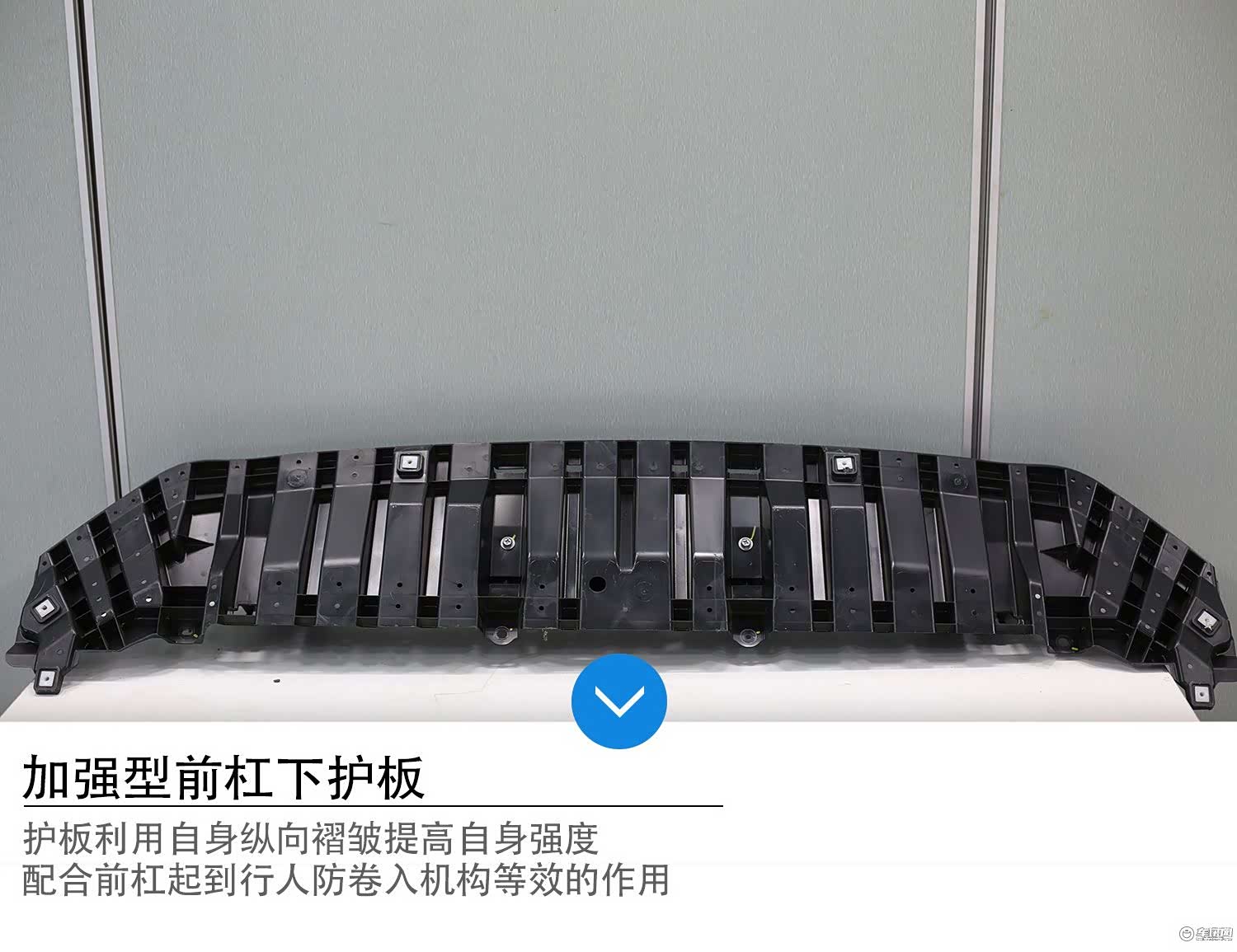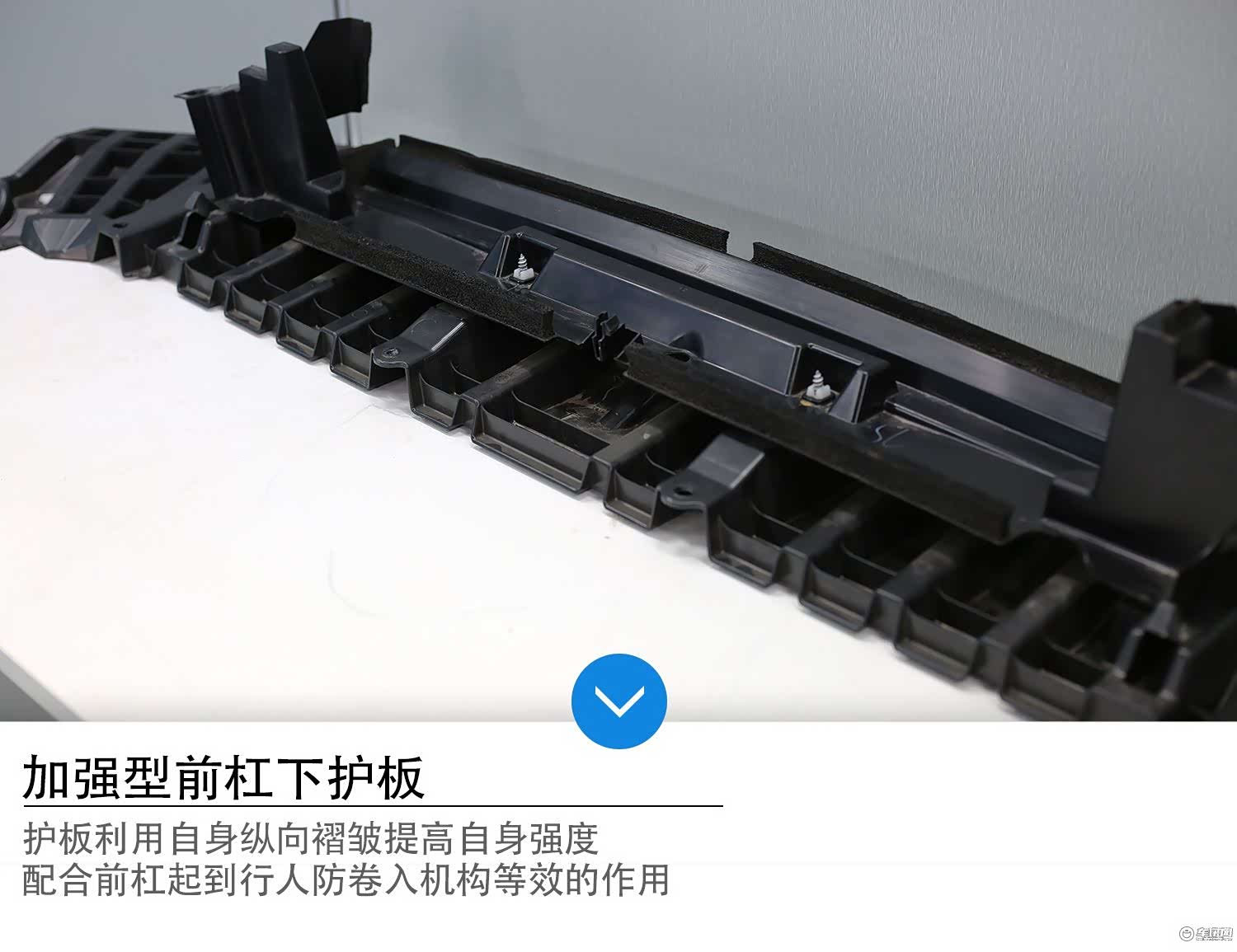 荣放巧妙的利用了前杠下护板,利用“纵向褶皱”加强了本体强度,同时配合前杠协同作用,撞到行人时,通过行人腿部较低位置受力,引导人体向上运动,落到发动机舱盖或前挡位置,这样就降低了二次碾压的风险。