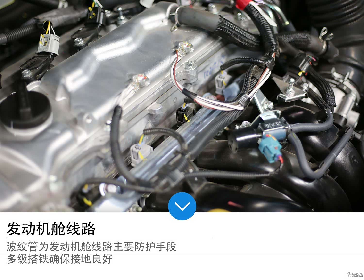 荣放发动机舱内线束主要使用了波纹管作为线束的主要防护手段,布局走向合理,多点位搭铁确保了整车线路可靠接地。