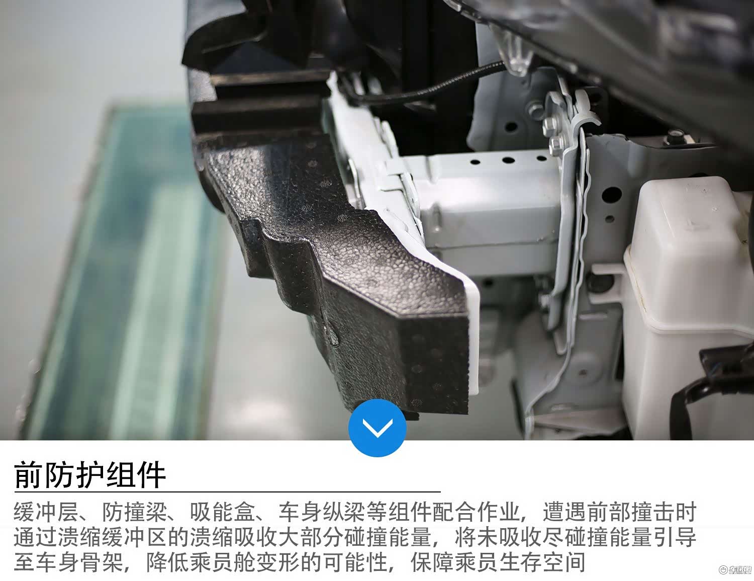 如上图所示,缓冲层、防撞梁和吸能盒就是这样搭配的,在碰撞中各司其职,最终将剩余碰撞能量引导至车身纵梁,并通过进一步溃缩、向后传递来分散、吸收碰撞能量,保障乘员舱安全。