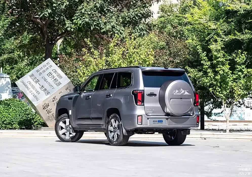 来到车侧,新车整体设计线条与现款车型一致,但同样加入了亮黑色的装饰进行点缀。车尾尾灯风格取消了灯腔内的红灯笼造型,在视觉上更显扁平化风格,车尾标改为了BJ60e,显示了车型采用魔核电驱的身份。