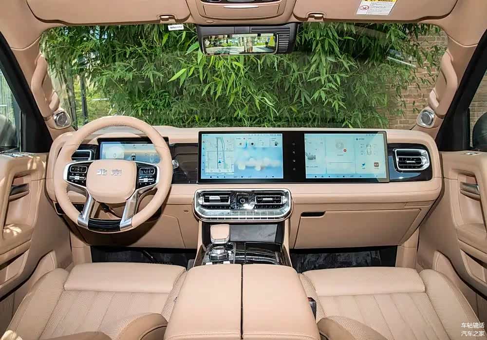内饰方面,北京BJ60雷霆车内布局同样延续了新一代北京BJ40的风格,中控屏和副驾驶屏采用一体式造型。此外,新车拥有10.25英寸液晶仪表、12.8英寸中控触控屏(支持19种常规应用)+12.8英寸副驾娱乐屏、1.92英寸启动按键屏、9英寸流媒体后视镜以及HUD抬头显示。