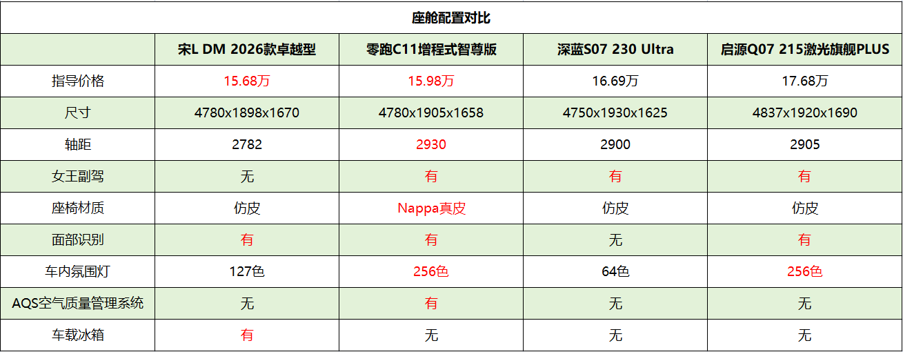 4款SUV均定位中型车,其中启源Q07的车身尺寸更大,零跑C11的轴距更大,从实际体验出发,2款车的乘用空间的确更大,即便全家都是高个子也无虞。其中只有零跑C11提供Nappa真皮、空气质量管理系统,在座舱环境方面更为豪华和环保;而比亚迪宋L DM的冷暖冰箱,也是个实用性很高的配置,买回去肯定用得上。
