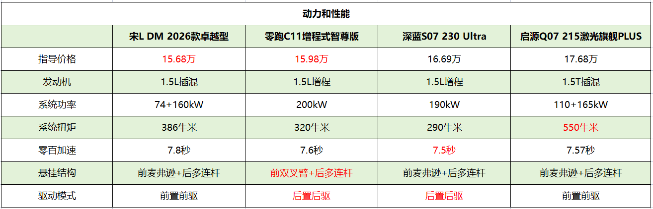 虽然4款SUV的动力参数有明显差异,但零百加速时间相差不大,实际测试几乎感受不到区别。其中零跑C11和深蓝S07为后置后驱结构,驾驶感受比宋L DM和启源Q07更灵活。
