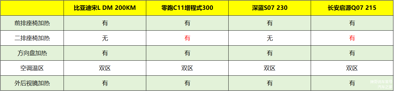开头我们就讲到,冬季用车的一大痛点就是车厢环境,所以我们还要考虑冬季舒适配置。从下表中能看到,4款车型均搭载了前排座椅加热、方向盘加热和外后视镜加热,但第二排座椅加热只有零跑C11和长安启源Q07提供。从现实场景出发,购买15万级SUV的用户,大多数已经成家立业,接送配偶\孩子是每天必行的日程,有了后排座椅加热,可以让家人得到更温暖舒适的出行环境。