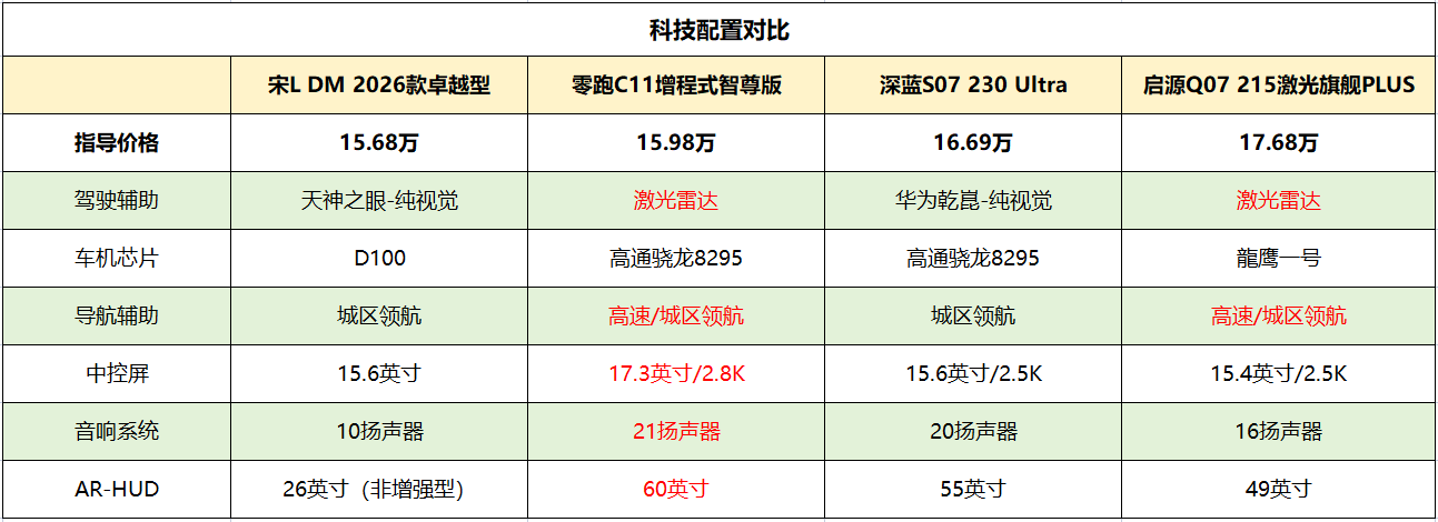 我们以4款混动SUV的长续航版进行对比,可以发现比亚迪宋L DM 200KM、零跑C11增程式300的价位均在15万级左右,长安启源Q07 215和深蓝S07 230的价格跨度较大,其中深蓝S07还有1款300KM续航版售价17.39万元,也远超本期15万级SUV的推荐范畴,所以不做介绍。