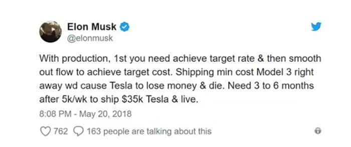 当然,车辆的成本与产能规模有很大的关系,这个每辆2.8万美元的成本估算很有可能是按照1万辆/周的产能水平。而目前,特斯拉还在为6月底之前实现5,000辆/周的产能而努力。
