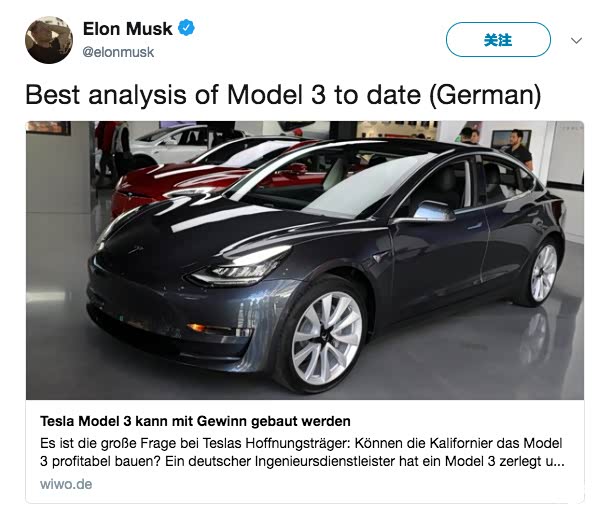 德国杂志WirtschaftsWoche日前发表了Model 3重磅分析,重点分析了Model 3的成本。对此,特斯拉掌门人埃隆·马斯克称其为“迄今为止最棒的”Model 3分析,并对其中关于成本估算准确性的求证回应道:“当然。”