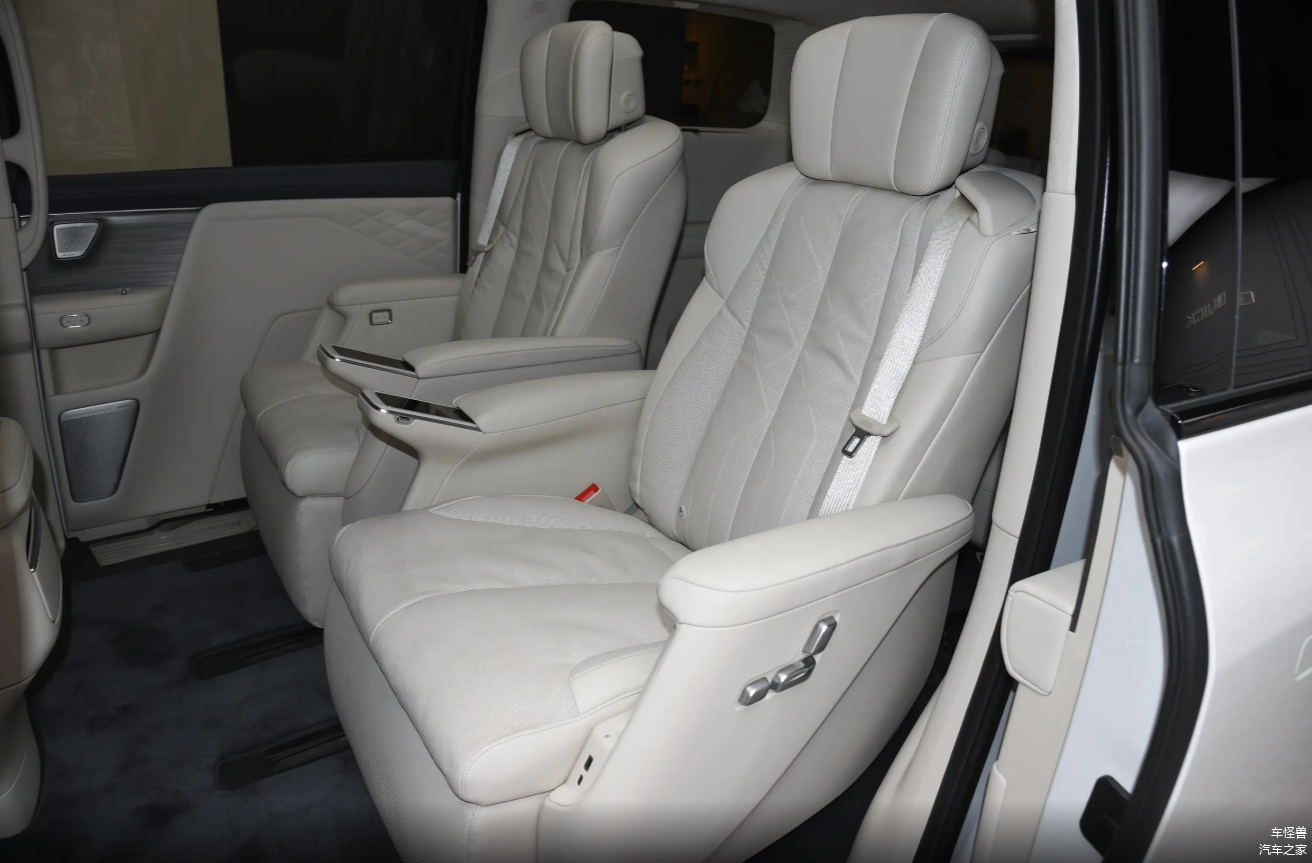 走进车内,内饰的科技感与豪华感扑面而来。车内配备了三块液晶显示屏,全液晶仪表尺寸为10.25英寸,中控屏幕和副驾驶屏幕尺寸均为16.3英寸,大尺寸的屏幕让车内操作和信息显示更加清晰便捷。车载芯片选用高通骁龙8775,性能强劲,能确保车机系统流畅运行。座椅采用Nappa真皮制成,质感上乘,乘坐舒适。后排液晶屏幕尺寸为21英寸,无论是观看视频还是娱乐休闲,都能带来出色的视觉体验。第二排配备的两个航空座椅,进一步提升了乘坐的舒适性和尊贵感。而且,车载冰箱作为标配出现,为车内生活增添了便利。