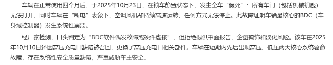 第二个案例是车辆假死。有车主投诉,车辆在锁车静置状态下发生全车“假死”,所有车门(包括使用机械钥匙)无法打开,同时空调风机在车辆“断电”表象下持续高速运转且无法停止。此故障被指为车辆最核心的BDC(车身域控制器)发生了系统性崩溃。在后续纠纷中,车主质疑厂家仅口头判定为“BDC软件偶发故障或硬件虚接”,但拒绝提供书面报告。