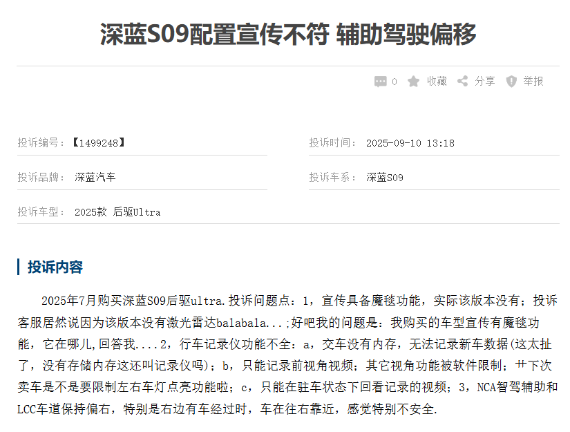 既然营销层面都这么抽象了,那产品层面的问题,就是“只多不少”。第一个问题需要接着“魔毯悬挂”案例来说,这名车主的车辆除了没有魔毯悬挂之外,还存在辅助驾驶时车辆偏右、记录仪没有存储空间导致功能不足等问题。