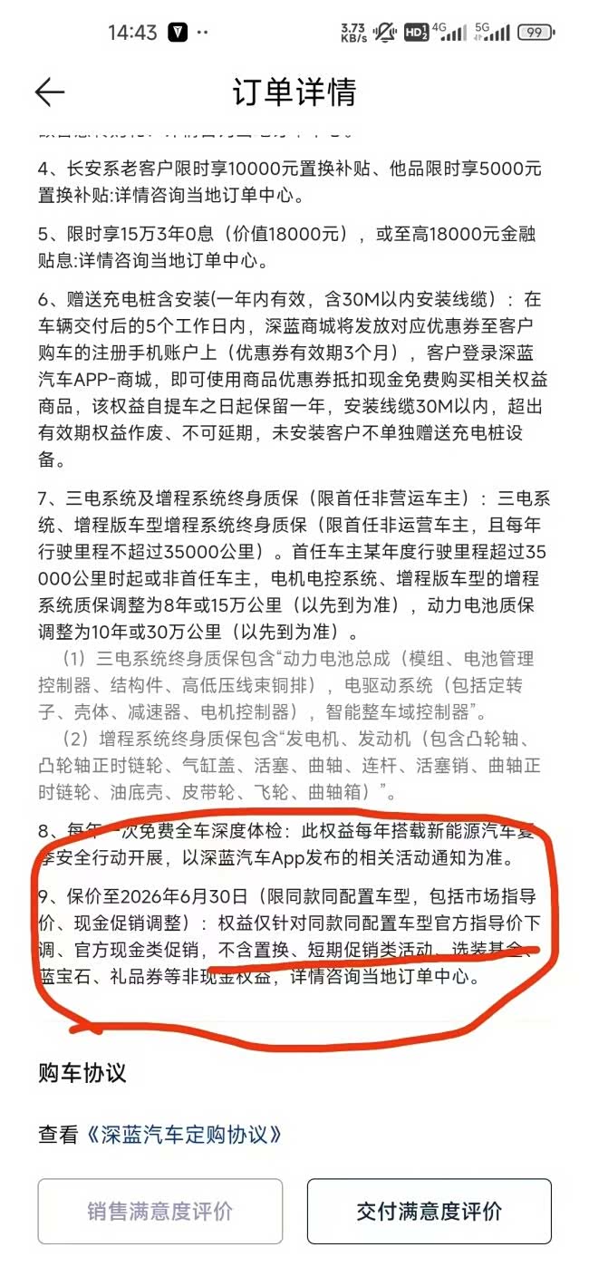 第三个问题是保价,深蓝汽车曾为首批车主提供“一年保价”协议,但车型上市仅三个多月后,官方就推出了电池容量更大(从40.18度提升至53.49度)、续航显著增加并支持5C超充的新款车型,且官方指导价与老款持平。此举被大量车主质疑为“变相降价”,导致老款车型迅速贬值,认为保价承诺形同虚设。法律界人士指出,该行为可能违反保价协议精神,并涉嫌侵害消费者的公平交易权和知情权。