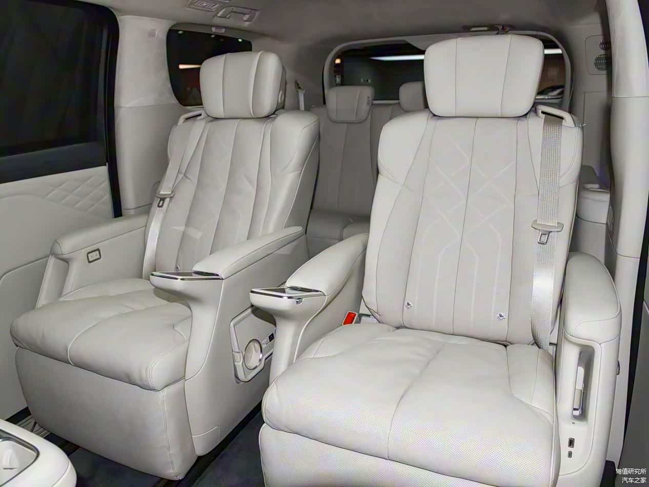 至境世家外观方面,采用封闭式前脸设计,L形分体式前灯组,配备隐藏式车门外把手。侧面配备了后排隐私玻璃。尾部采用贯穿式尾灯组和发光车标。新车尺寸长宽高分别为5260/2023/1820mm,轴距为3160mm,提供6座和7座两种座椅布局选择。