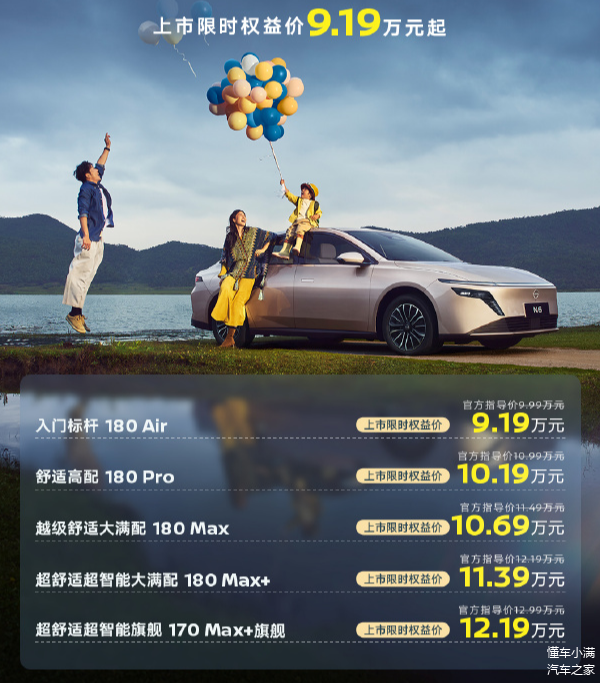 首先来看价格, 日产N6(图片 | 参数 | 询价)将推出5款车型配置可选,指导价区间为9.99-12.99万元,不过为进一步凸显诚意,官方又提供限时售价区间9.19-12.19万元。也就是说这款插混动力的中型轿车对于手握10万左右预算的朋友们正合适,如果你之前还在关注比亚迪秦L、吉利银河A7等车型,现在无疑是又多了一个选择。那接下来咱们就聊聊东风日产N6都有哪些亮点,它能否在与国产新能源竞争时占据上风呢?