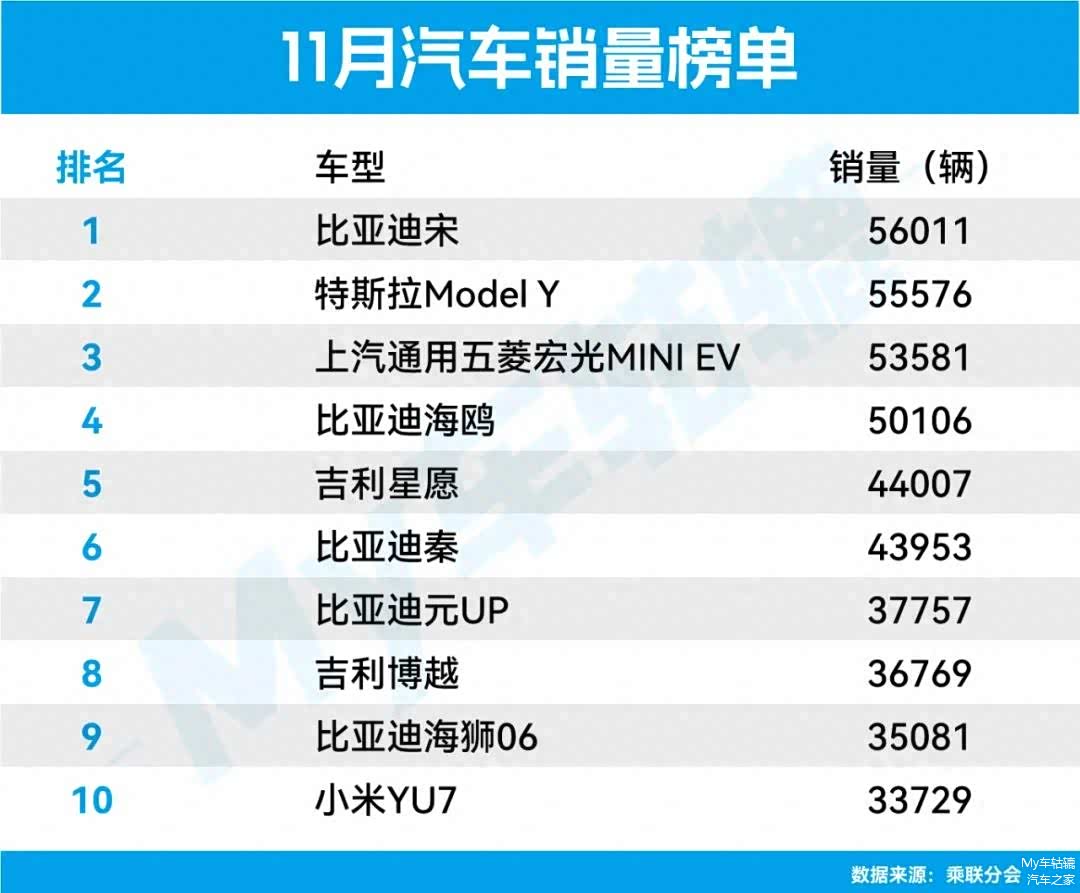 11月前十款热销车型,大多数是以通勤代步车为主,售价集中在几万元到十五万元。令人颇为意外的是,均价在25万元以上的特斯拉Model Y、小米YU7,竟然也能跻身前列,也说明了当下汽车消费升级更为看重车辆的智能化水平和三电技术。由于差距较小,日产轩逸、大众速腾、问界M7等车型也有望逆袭,究竟谁会被拉下马?