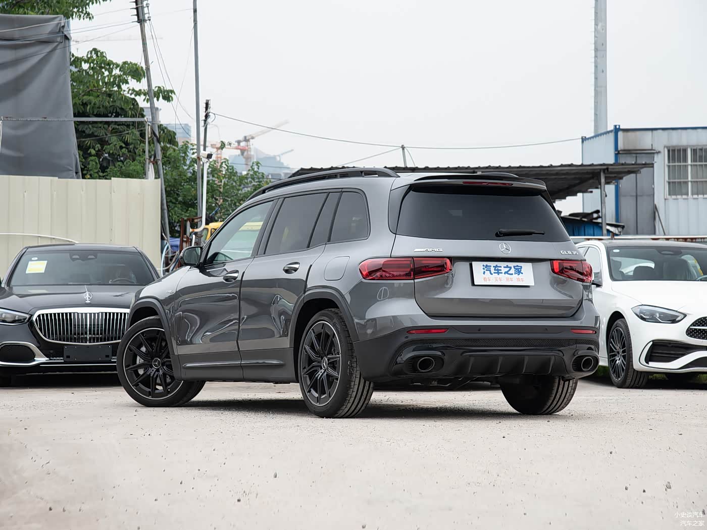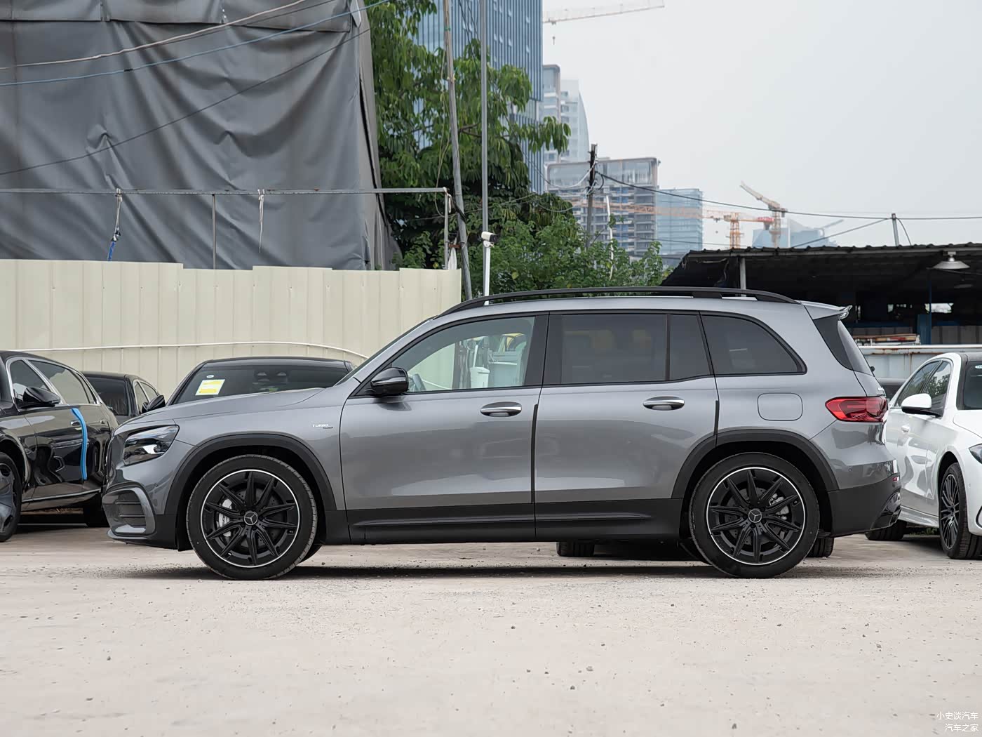 再来看车身侧面部分,车身侧面线条流畅而富有张力,勾勒出GLB AMG的硬朗轮廓。一条深刻的腰线从前翼子板一直延伸至尾灯,增强了车身的视觉长度和立体感。车顶线条微微下压,营造出蓄势待发的姿态,搭配大尺寸AMG专属轮毂,进一步强化了运动属性。车身尺寸为4658mm(长)×1845mm(宽)×1662mm(高),轴距达到2829mm,为车内提供了宽敞的空间基础。车窗周围的镀铬装饰和车顶行李架不仅提升了实用性,更增添了车辆的精致感。整体车身比例协调,既保持了SUV应有的高大姿态,又不失运动车型的灵动。