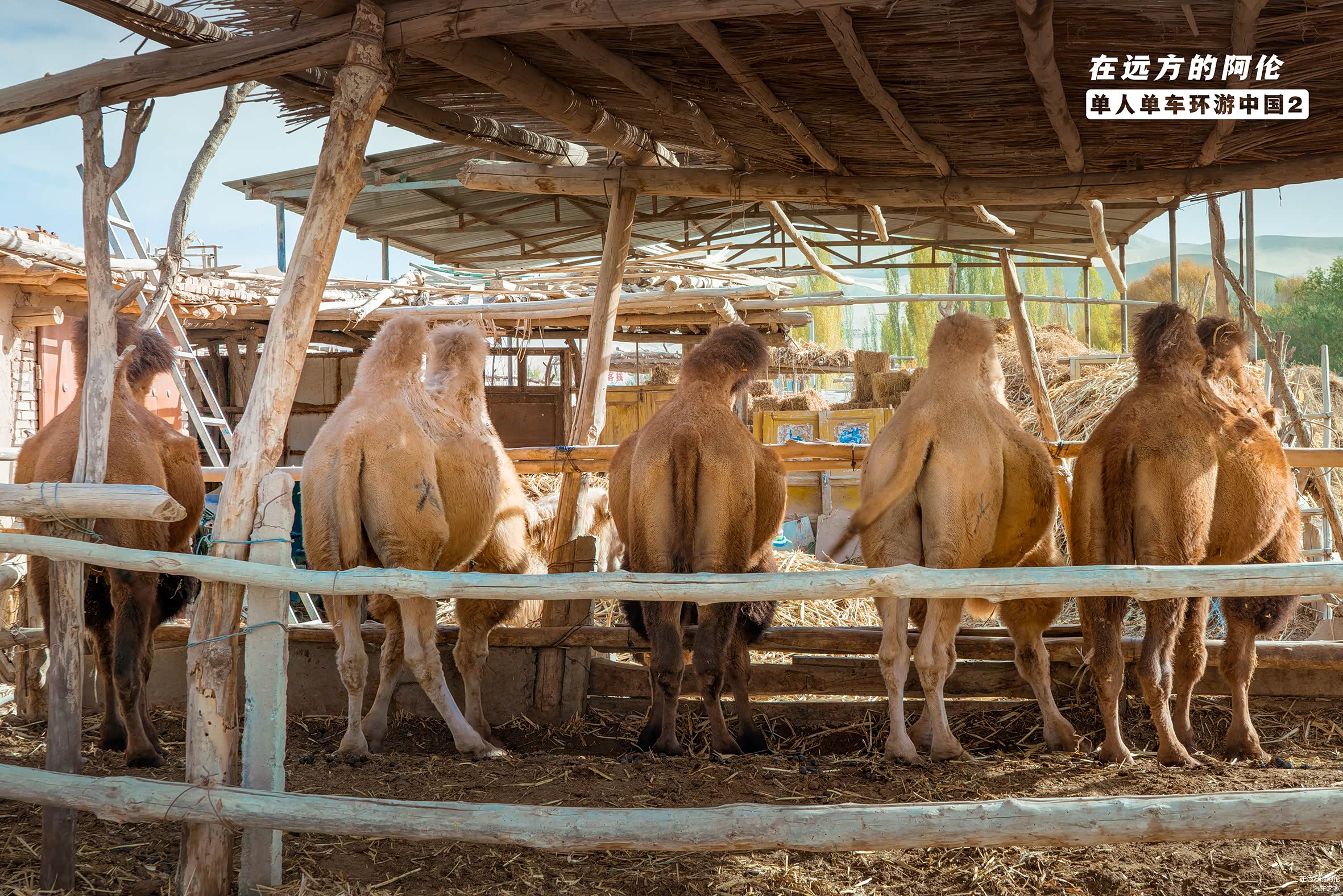 有条路的尽头是养骆驼的地方,这些骆驼应该是鸣沙山景区供游客骑乘的骆驼;我估计它们都分属于不同的农家进行承包饲养,并由景区进行统一的调配。