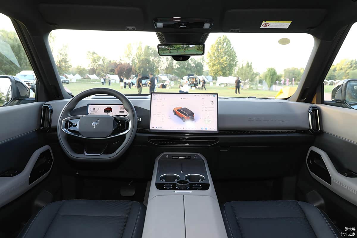 外观部分,这辆福特智趣烈马采用了和燃油版烈马不同的设计,整体还是采用了方盒子式的风格,视觉效果很硬朗下面来详细看一下。