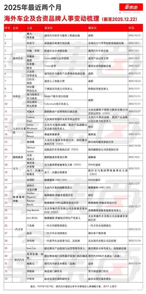 最近俩月合资品牌及海外汽车品牌人事变动梳理(截至2025.12.22)