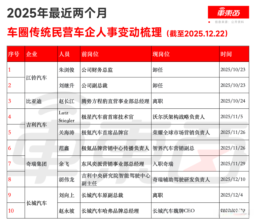 最近俩月传统民营车企人事变动梳理(截至2025.12.22)