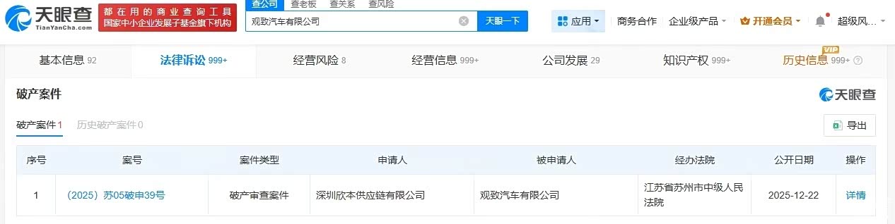 12月22日,观致汽车有限公司新增一则破产审查案件,申请人为深圳欣本供应链有限公司,经办法院为江苏省苏州市中级人民法院。