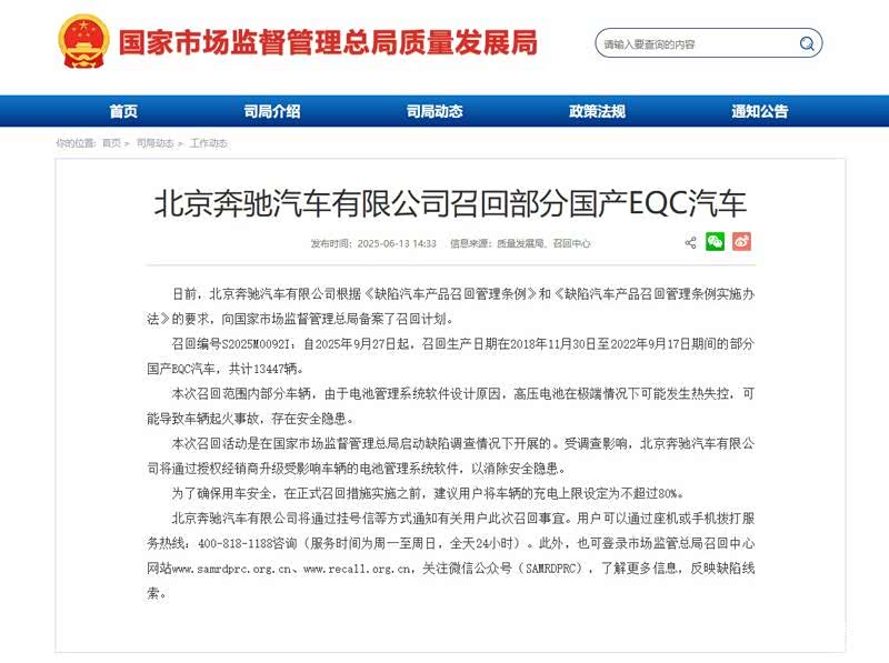 据国家市场监督管理总局公告,2025年6月13日,北京奔驰汽车有限公司备案召回计划(召回编号S2025M0092I):自2025年9月27日起,召回2018年11月30日至2022年9月17日生产的部分国产 EQC(图片 | 参数 | 询价)汽车,共计13447辆。召回原因为“电池管理系统软件设计缺陷,高压电池在极端情况下可能热失控,导致车辆起火”。奔驰官方称,将为召回车辆免费升级电池管理系统软件,以消除安全隐患。