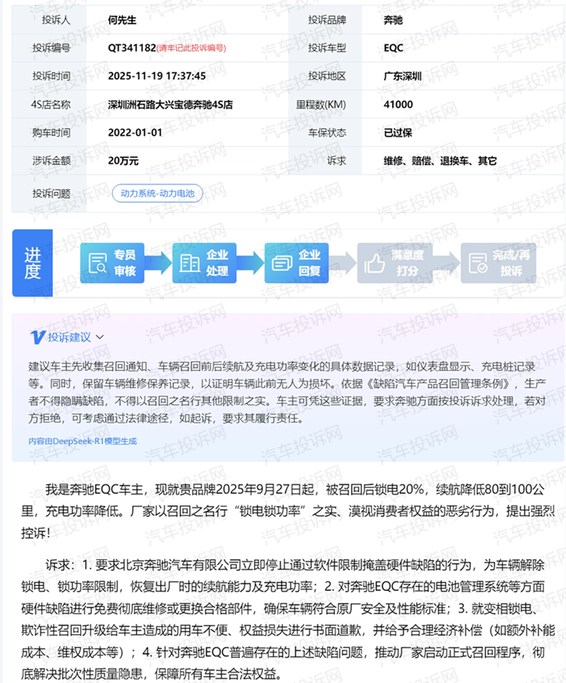 一位浙江车主通过网络平台发文表示,2025年7月27日收到北京奔驰的电池管理升级通知,完成升级后,就出现了车辆续航里程下降的情况,充电时无法达到原定续航里程。他多次拨打奔驰客服电话并反馈至经销商,但问题仍未解决。该车主表示,奔驰在未征得同意的情况下,以“召回”名义对车辆进行强制锁定操作,导致电池性能受限。该车主要求奔驰恢复车辆原充电续航、赔偿损失并公开道歉,同时更换存在安全隐患的电池。
