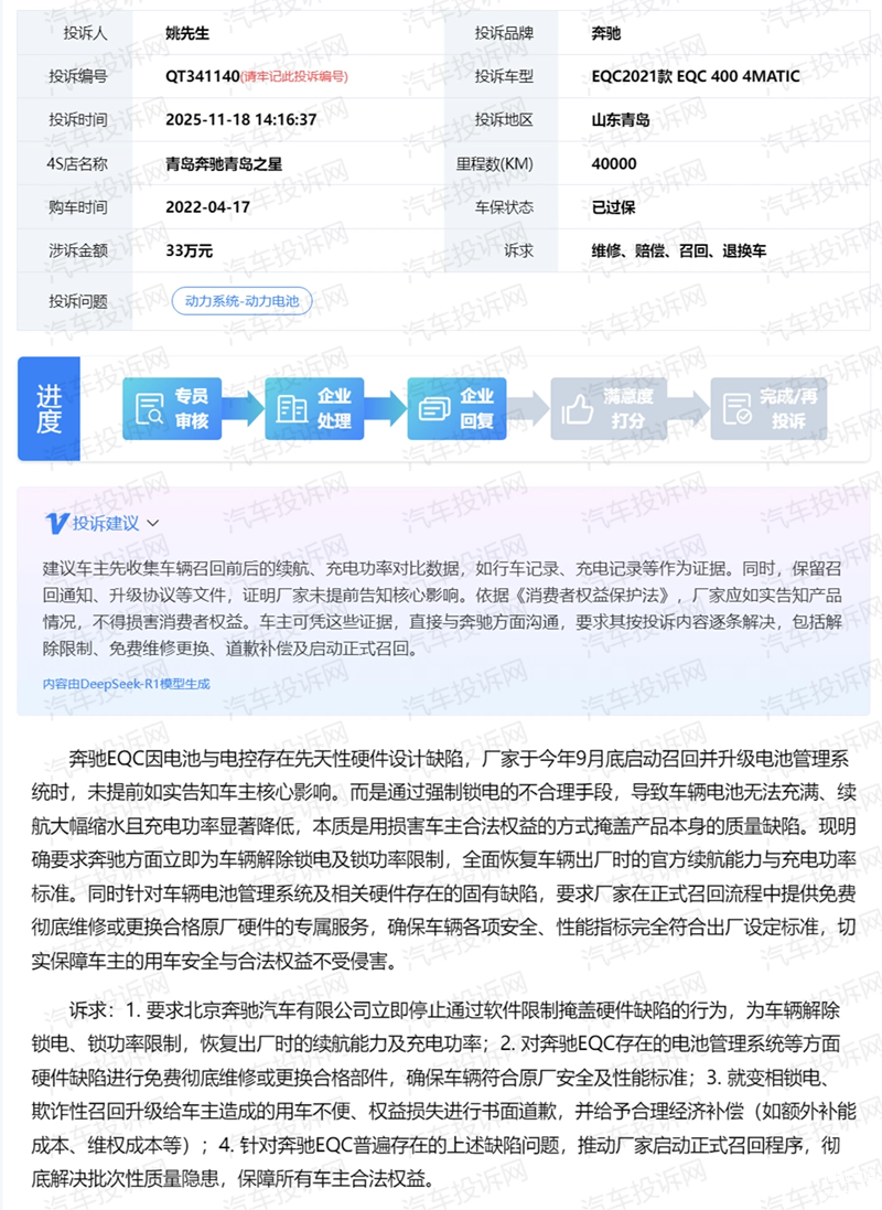 山东青岛车主姚先生则指出,奔驰厂家于今年9月底启动召回并升级电池管理系统时,未提前如实告知车主核心影响。而是通过强制锁电的不合理手段,导致车辆电池无法充满、续航大幅缩水且充电功率显著降低,本质是用损害车主合法权益的方式掩盖产品本身的质量缺陷。