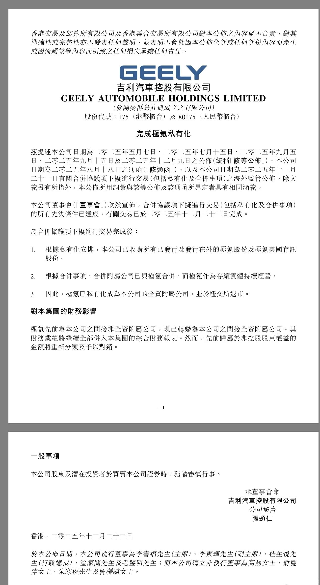 12月22日,吉利汽车控股有限公司(0175.HK)(简称“吉利汽车”)发布公告,宣布已正式完成极氪智能科技控股有限公司(简称“极氪”)私有化及合并事项的交易,极氪已成为吉利汽车的全资附属公司,并从即日起于纽交所退市。