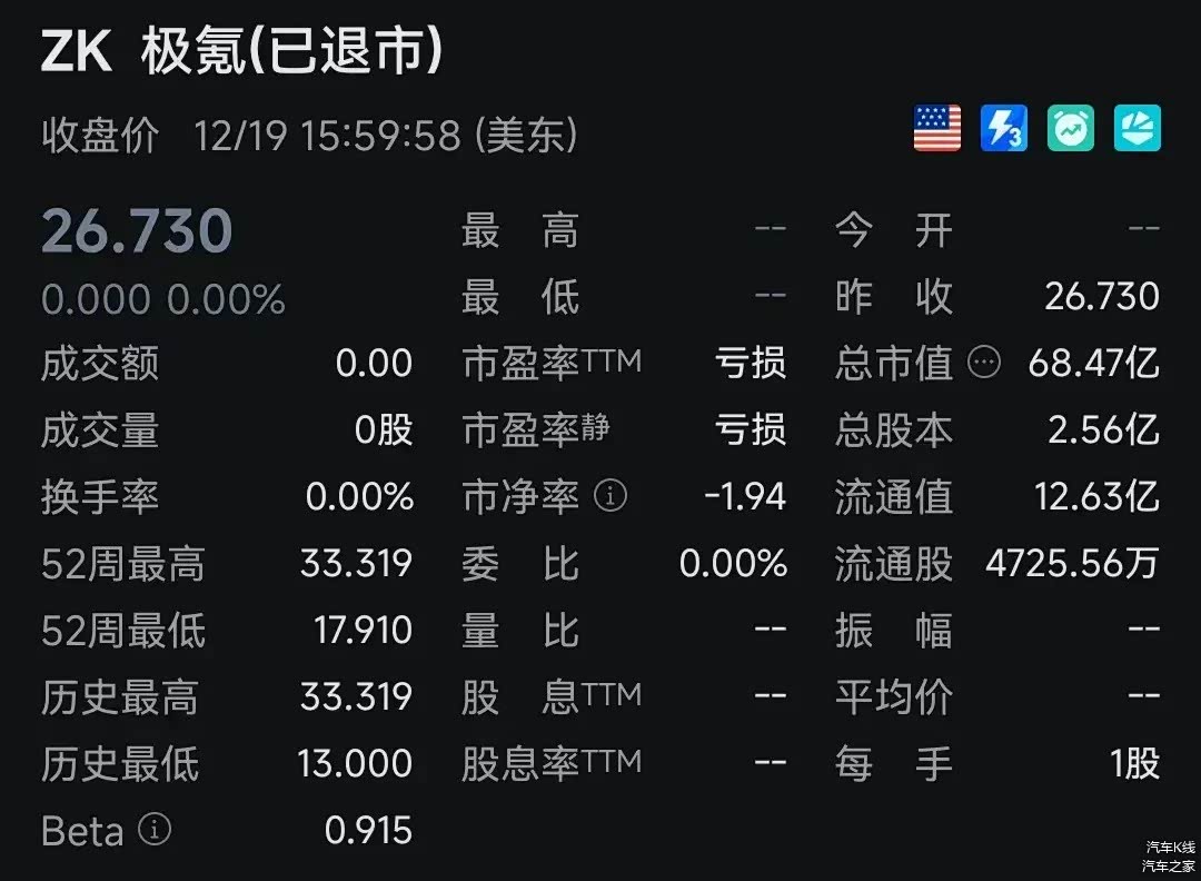 在极氪退市前最后一个交易日(12月19日),其股价收于26.73美元/股,总市值定格在人民币481.28亿元。
