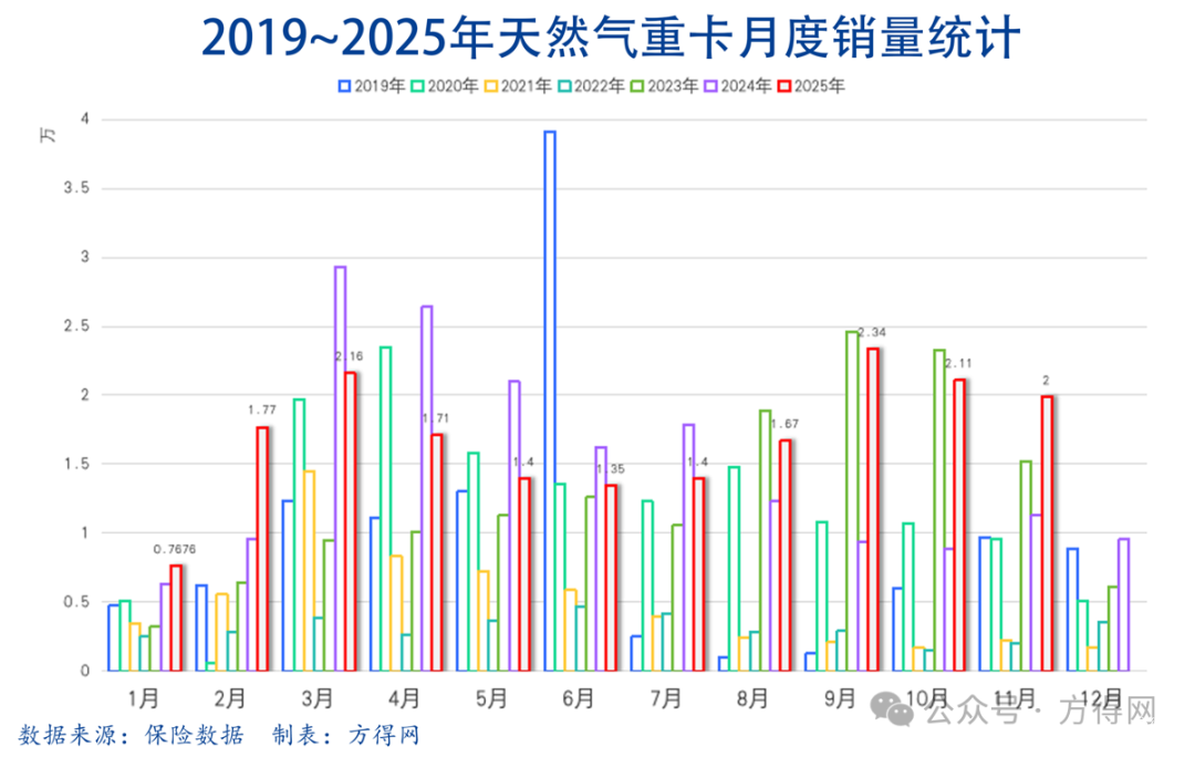 连续5 个月同比下滑后,从2025年8月开始,国内天然气重卡市场实现“四连增”,尤其最近3个月,月销量连续超过2万辆,9月10月同比增幅甚至翻倍!