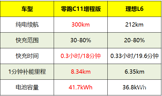 理想L6 Pro提供36.8kWh的电池包,纯电续航里程212KM,20-80%快充时间为0.33小时/19.6分钟。我也帮大家算了一下补能时间,理想L6一分钟补能6.35KM,零跑C11一分钟补能8.34KM,很显然,零跑C11的纯电里程和补能效率,要更适合城区代步,可以更轻松的实现0油耗出行。