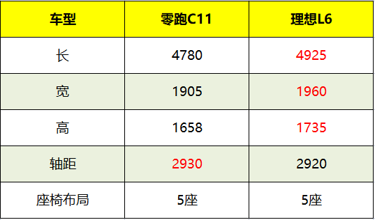 买SUV的车友很重视空间,零跑C11是中型SUV,理想L6是中大型SUV,两款车在尺寸上确实有明显的区别,但决定空间的不仅仅是尺寸,也在于轴距,大家可以看到,零跑C11轴距2930mm,要比理想L6长了10mm,两款车都是五座布局,从实际体验来看,零跑C11的前后乘坐空间和理想L6在一个维度,很难直观感受到两款车的区别。