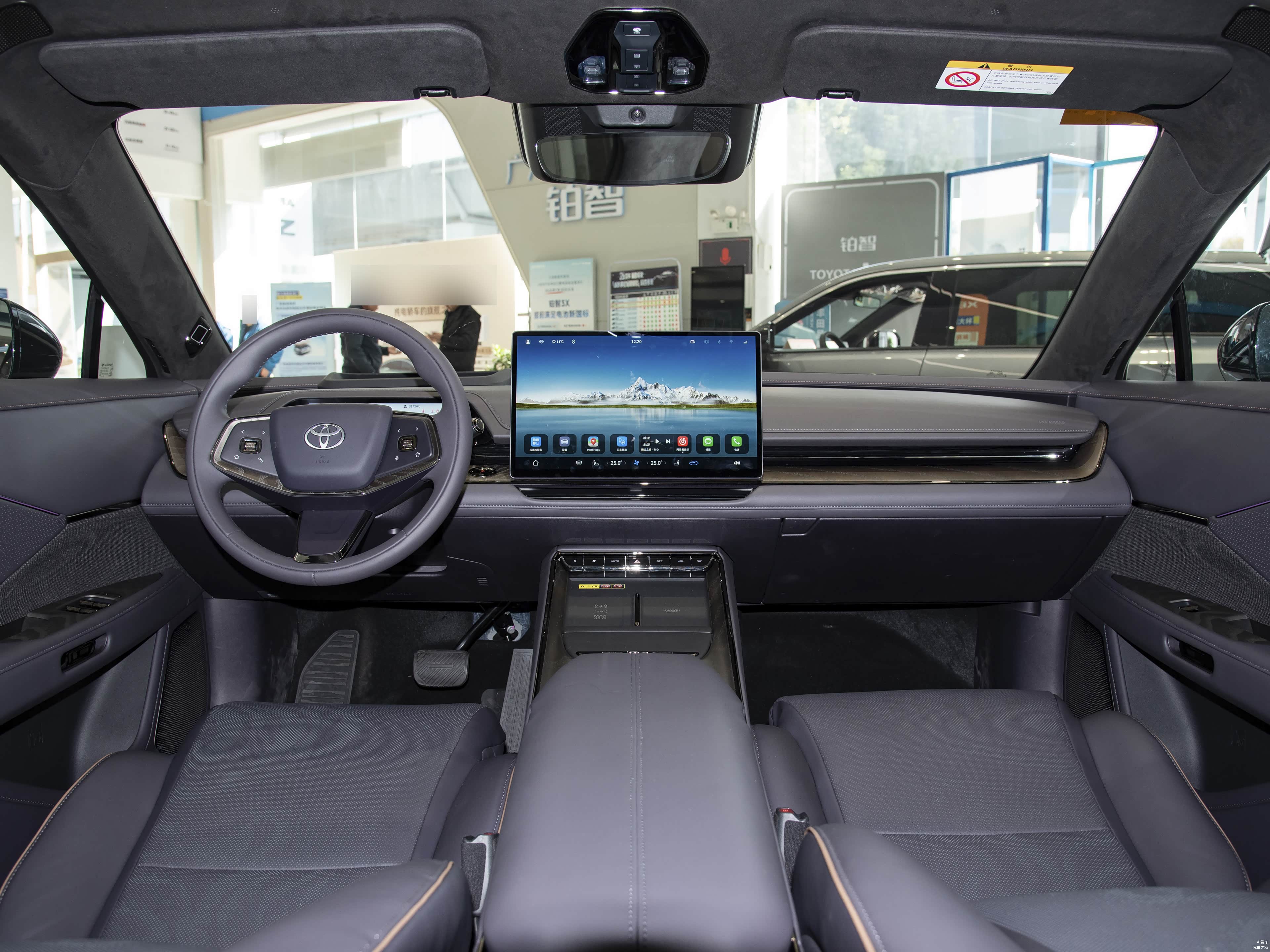 外观是丰田bZ家族那套锤头鲨设计。封闭式前脸配C型贯穿LED日行灯,顶部藏激光雷达,点亮后光带效果挺有科技感。矩阵LED大灯支持自适应远近光,前保险杠主动进气格栅能根据车速和电池温度自动调节。车尾贯穿LED尾灯带立体蜂窝纹路,刹车还有流水动态,大尺寸扰流板加黑色后包围,视觉效果不错。