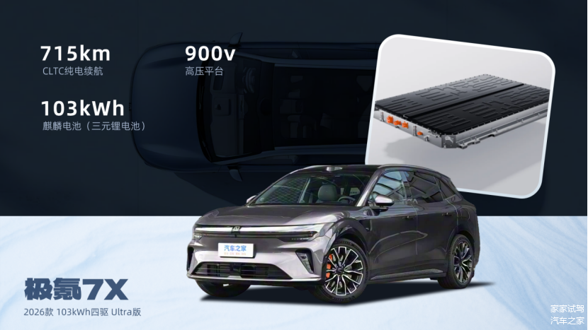 作为四款车中唯一的纯电车,极氪7X 2026款103kWh四驱Ultra版,采用900V高压平台和103kWh三元锂电池,CLTC纯电续航715km,10%-80%快充为0.17小时,我们之前对该车进行了实测,零上气温条件下百公里电耗约16.5kWh,在纯电四驱车型里是比较优秀的水平,而且车辆充电速度很快,适合充电网络覆盖较好地区的朋友们。如果气温下降至零下,又是长途旅行的话,建议多预留充电安全余量。