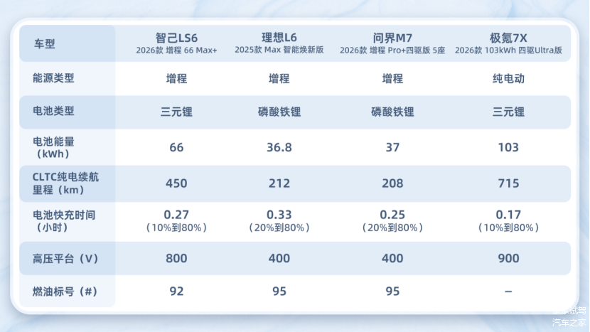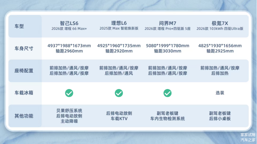 它们分别是: 智己LS6(图片 | 参数 | 询价) 2026款增程66 Max+,理想L6 2025款Max智能焕新版,问界M7 2026款增程Pro+四驱版5座,极氪7X 2026款103kWh四驱Ultra版,看看哪款车最适合你的用车场景。
