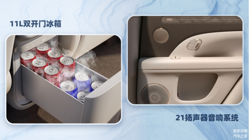 同时车内还有21扬声器音响系统,7.1.4独立声道搭配千瓦级功放,听音乐就像在沉浸式影院一样,好音响很重要,编辑跑高速就比较喜欢听音乐。11L双开门大冰箱,也是四台车中容积最大的,超宽控温区间,无论是雪糕还是暖饮都能妥妥放下。同时该车搭载主动降噪技术能有效过滤路面噪音和风噪,车内怠速噪音不到36dB,就算在高速上也能和家人安静交谈,孩子玩累了安心睡觉,不会被噪音打扰。