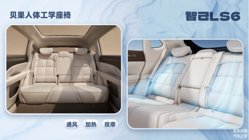 智己LS6座舱得房率近90%,同级最高,它意味着相同的车身尺寸下,留给乘员的实际使用空间更大——前排空间足够大,后排空间也很充裕,不会有压迫感,老人孩子坐着都舒展。贝果人体工学座椅特别贴合身体曲线,能有效分散身体压力,长时间坐着也不会腰酸背痛。副驾“超级右排”头等舱是一大亮点,支持零重力、贵妃椅、折叠三种模式,就像把顶级航司的头等舱搬进了车里,长辈可以躺着休息,孩子也能在上面玩耍,长途疲劳感大大缓解。该车前后排均搭载座椅通风、加热、按摩功能,表现出色。
