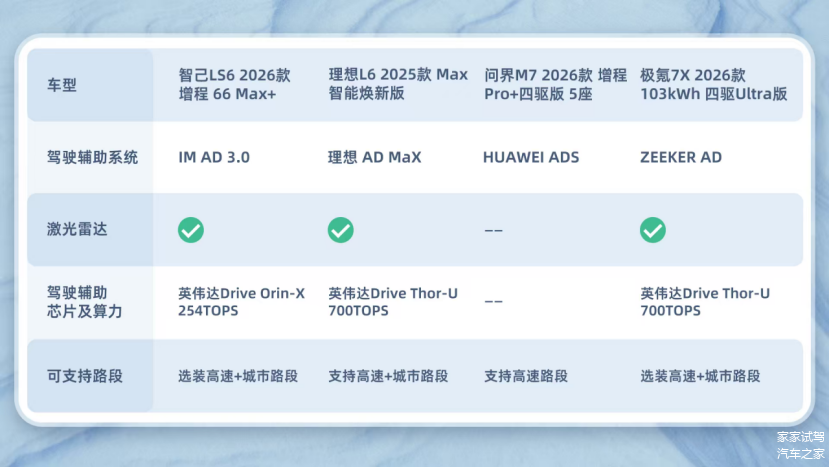 北方冬季雨雪多,假期中出行要长途开车,车流量又大,智能辅助驾驶和安全防护就显得特别重要。通过表格可以看出,理想L6的硬件配置和驾驶辅助覆盖路段表现最好,问界M7的驾驶辅助系统有口皆碑,表现突出,而智己LS6和极氪7X则有其他杀手锏。