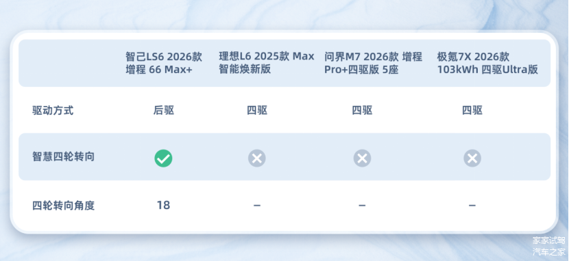说到冬季行车安全,自然少不了驾控,对于常年在冰雪路面开车的用户,智能四驱系统是个加分项,它对易滑路面的操控稳定性有较大的帮助,四车中理想L6、问界M7、极氪7X均搭载了智能电四驱系统,值得表扬。而智己LS6增程版虽只有后驱版,但它可武装了很强的“黑科技”。更重要的是它搭载双向18°后轮转向系统,让经验不多的新手司机也能在城市复杂狭窄路面游刃有余。