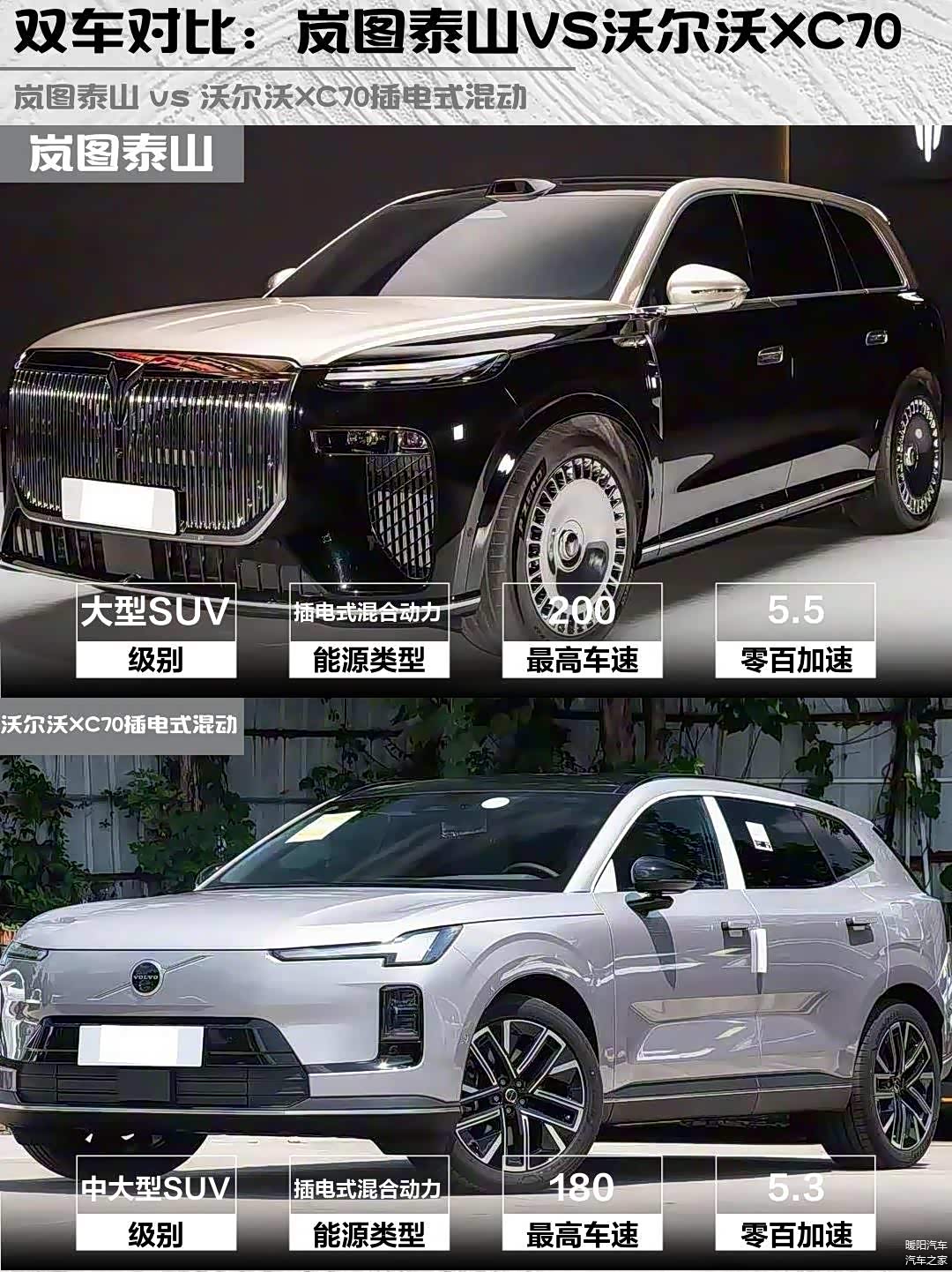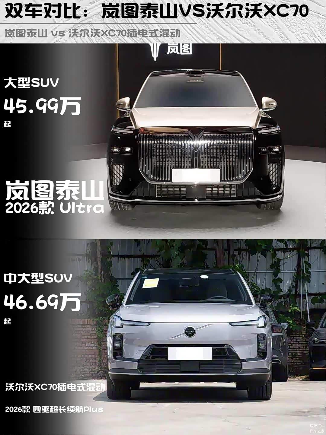 最近在选车的小伙伴看过来!今天深度对比两款40万级插混SUV——岚图泰山2026款 Ultra和 沃尔沃XC70插电式混动(图片 | 参数 | 询价)2026款 四驱超长续航Plus,实测干货分享👇