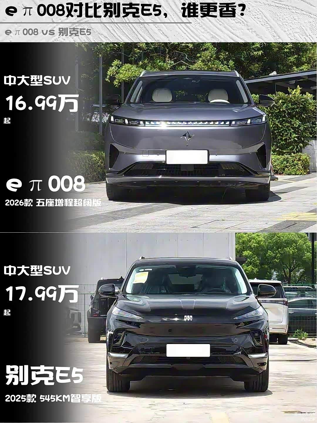 最近后台好多朋友在问:eπ008和 别克E5(图片 | 参数 | 询价)到底怎么选?今天直接拉出2026款五座增程超阔版和2025款545KM智享版实车对比,看完这篇你就懂了!🚗💨