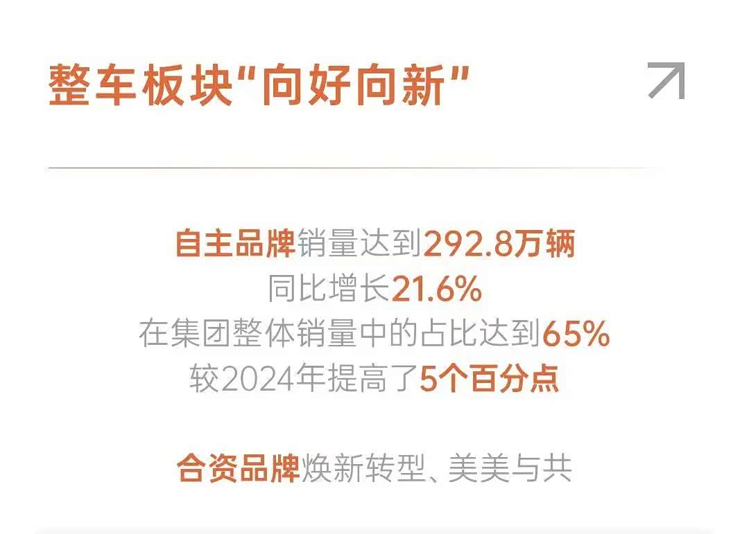 通过自主品牌乘用车、商用车业务实施一体化管理,上汽积极构建更灵活高效的运营体制机制,打通产品定义、研发、生产和营销全链路,更贴近用户需求、更敏捷响应市场。2025年,上汽自主品牌(荣威、MG、智己、大通、五菱、宝骏等)销量达到292.8万辆,同比增长21.6%,在集团整体销量中的占比达到65%,较2024年提高了5个百分点,在竞逐智电新赛道的关键阶段,自主品牌成为上汽创新发展的“主力军”和“急先锋”。