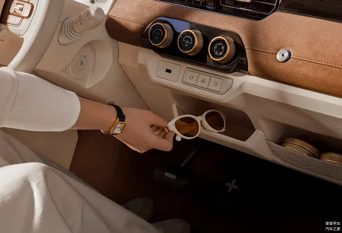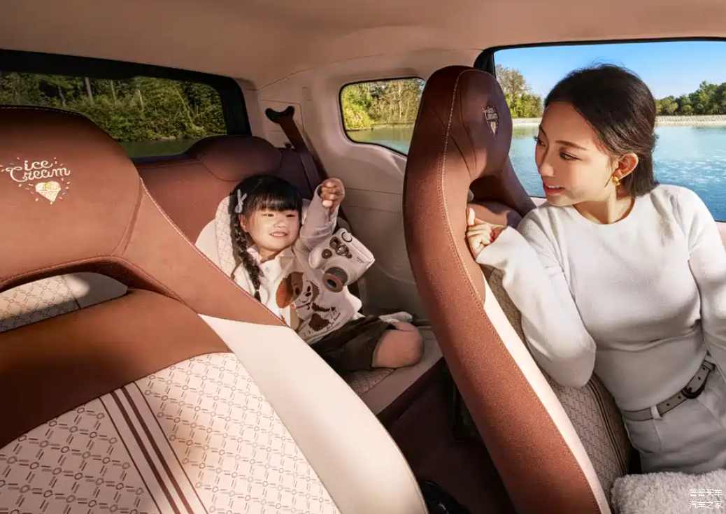 内饰方面,2026款QQ冰淇淋女王版的车内采用棕+米色的配色方案,中控台采用全新的绒布材质覆盖,双色座椅上的菱形格纹路增添了典雅质感,细节处的金色点缀与外观相呼应。