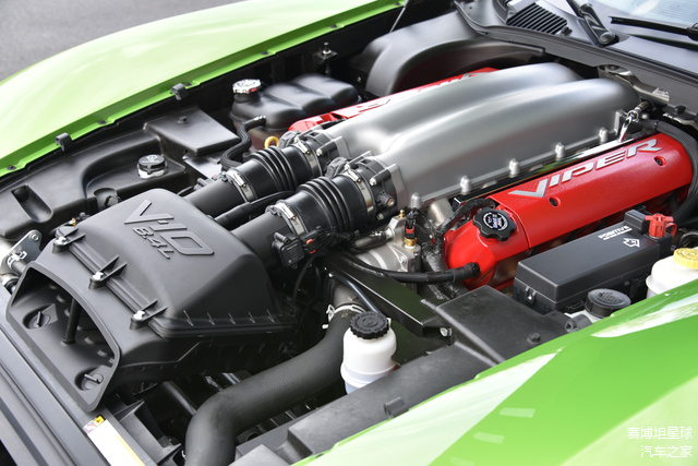 2017 道奇蝰蛇采用了向前翻转的引擎盖,下面依然是那台8.4L V10的心脏,但是马力进一步提升到了645匹,扭矩也达到惊人的814牛米,与之匹配的依然是一台6速手动变速箱,保持着纯粹的美式超跑的风格。