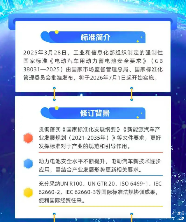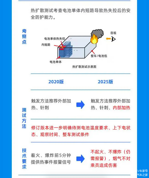 曾被视为行业难题的“热失控后不起火、不爆炸”技术,在2025年迎来强制性国家标准的落地。工信部于2025年年初发布《电动汽车用动力蓄电池安全要求》(GB38031-2025),定于2026年7月1日正式实施,一度被业内称为“史上最严电池安全令”。