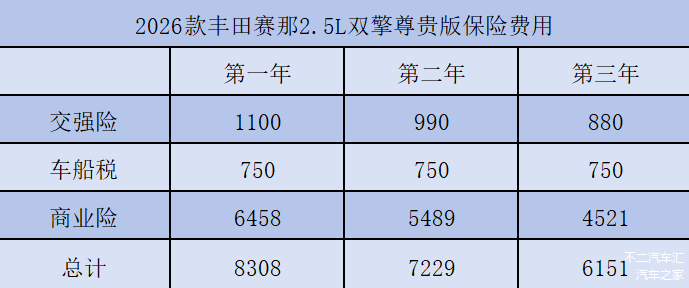 以2026款丰田赛那2.5L尊贵版为例,商业险仅交200万三者险和车损险的情况下,如果没有优惠,首年保险费用约为8308元,三年保险费用合计约21688元。