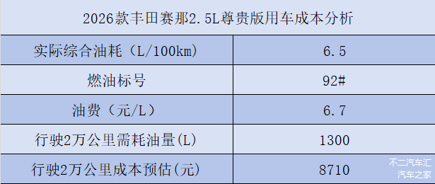 以2026款丰田赛那2.5L尊贵版为例,该款车的WLTC综合油耗虽然仅为5.66L,但由于驾驶习惯和路况的不同,实际用车油耗会与之有出入,如果单纯以该数据来计算,三年的用车成本,数据会有偏颇,所以此处将会根据网络油料统计平台数据,来进行对应的数据分析和计算。通过车主反馈来看,该款车在磨合期的表显油耗为7L左右,过了磨合期之后能降到6L,部分网友甚至能开出4.5L的成绩。因此综合来看,该款车的平均油耗为6.5L/100km,按照当前92号汽油油价6.7元每升,每年行驶两万公里计算,每年油料费约8710元,平均每公里0.44元。
