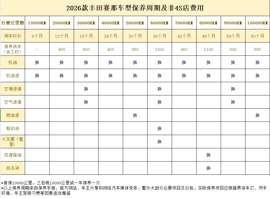 通过官方网站或车型用户手册查询,2026款赛那行驶六万公里保养费用大约需要5100元,行驶十万公里保养大约需要8134元。按照一年行驶两万公里计算第一年需要1700元。